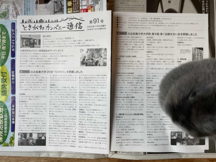 ときがわカンパニー代表の関根です。(一緒に写っているのは、うさぎのミミちゃん) 2025年11月16日(日)「ときがわカンパニー(同)通信」第91号を発行し、ときがわ町と鳩山町の新聞折込チラシとして、約4800部(ときが…