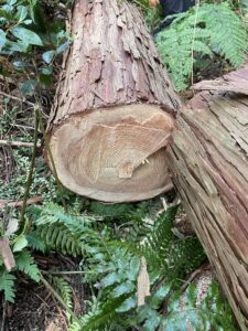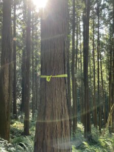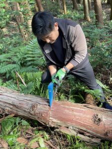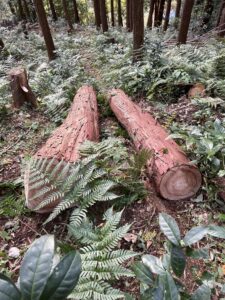 伐採したヒノキを、2.5m、2.5m、3.0mで、玉切りしていきます。