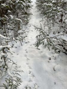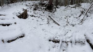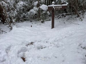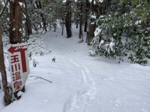 私達は、ここで左側の五明方面を降ります。まだ誰も通ってないです。獣の足跡に出会えるでしょうか。
