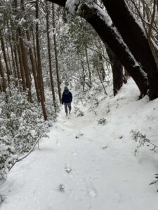 私ばかりが先頭を行って、新雪を踏むのも悪いので、奥さんに先に行ってもらいます。