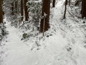 ここで、人間の足跡がありました。これまでなかったので、上から降ってきて、ここでUターンしたのでしょう。おそらく、小倉城跡に行こうとして、ここまで来て間違ったことに気付いたのかも。