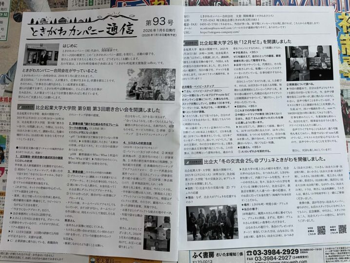2026年1月18日(日)「ときがわカンパニー(同)通信」第93号を発行し、ときがわ町と鳩山町の新聞折込チラシとして、約4800部(ときがわ町2800部、鳩山町2000部)を配付しました。