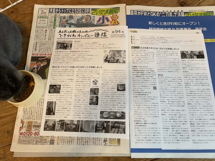 2026年2月15日(日)「ときがわカンパニー(同)通信」第94号を発行し、ときがわ町と鳩山町の新聞折込チラシとして、約4600部(ときがわ町2800部、鳩山町1800部)を配付しました*。(新聞販売店の皆さん、いつもありがとうございます。)