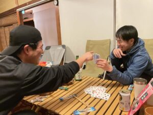 ババ抜きに興じるかずやさんと金井さん(比企大23秋)